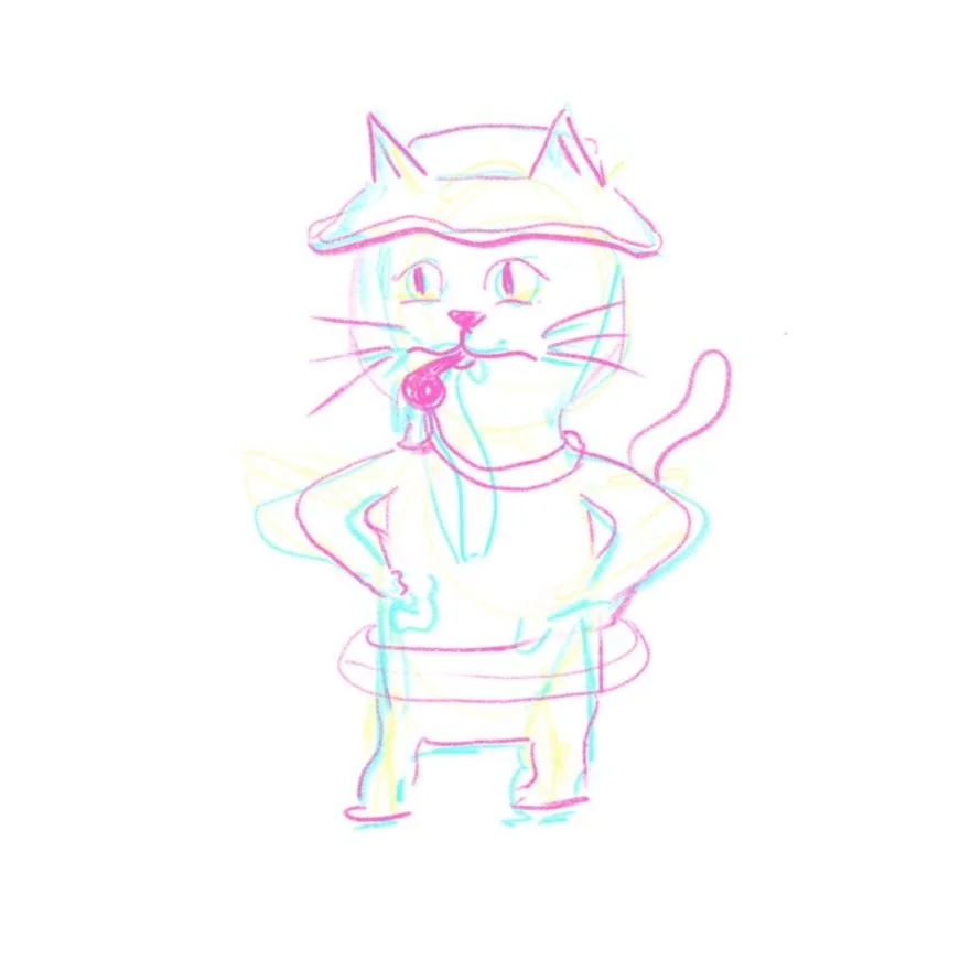 My concept was to create a funny design around an animal, which led me to develop characters of lifeguard cats that need help swimming with floating aides. This concept played on the irony of cats swimming, while the floating aides provided an empathetic connection to learning to swim.